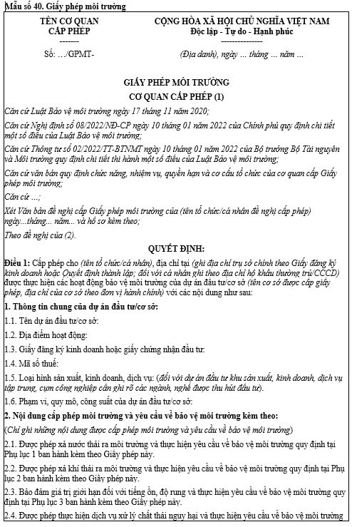 Theo Điều 40 Luật Bảo vệ Môi trường 2020, thời hạn của giấy về môi trường được xác định tùy theo nhóm dự án và loại hình hoạt động. Đây là một trong những nội dung quan trọng của giấy phép, bên cạnh các yêu cầu về bảo vệ môi trường và các điều kiện cấp phép.